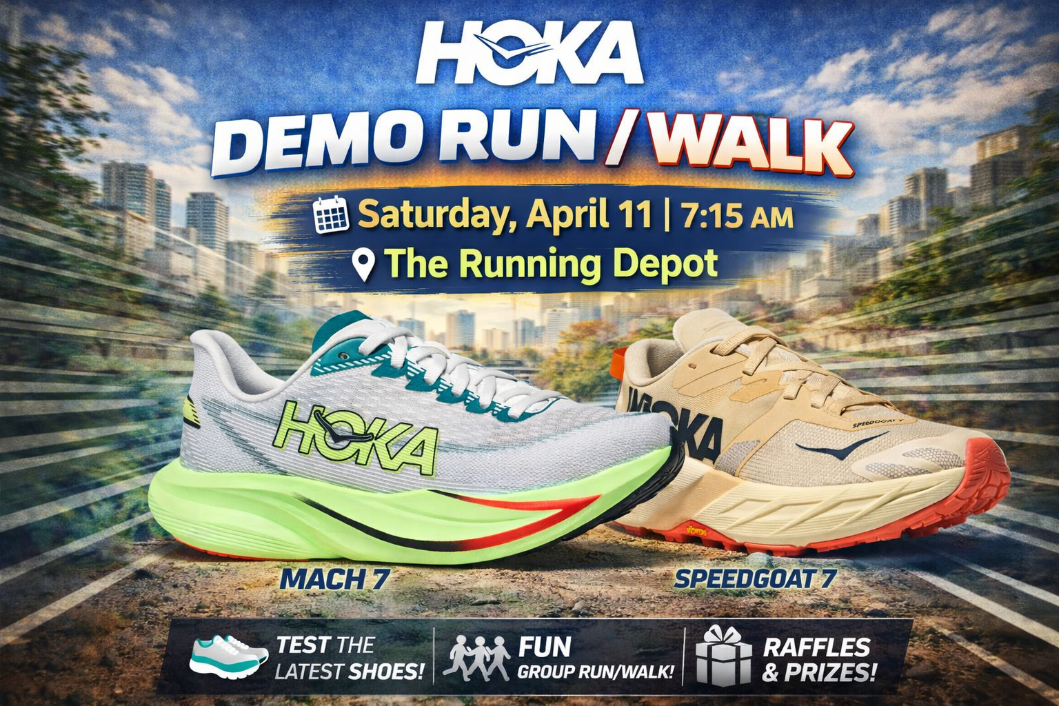 Grace from Hoka will be joining us for our Saturday morning fun run/walk. She will have the Mach 7 and Speedgoat 7 demo shoes to try before you buy!